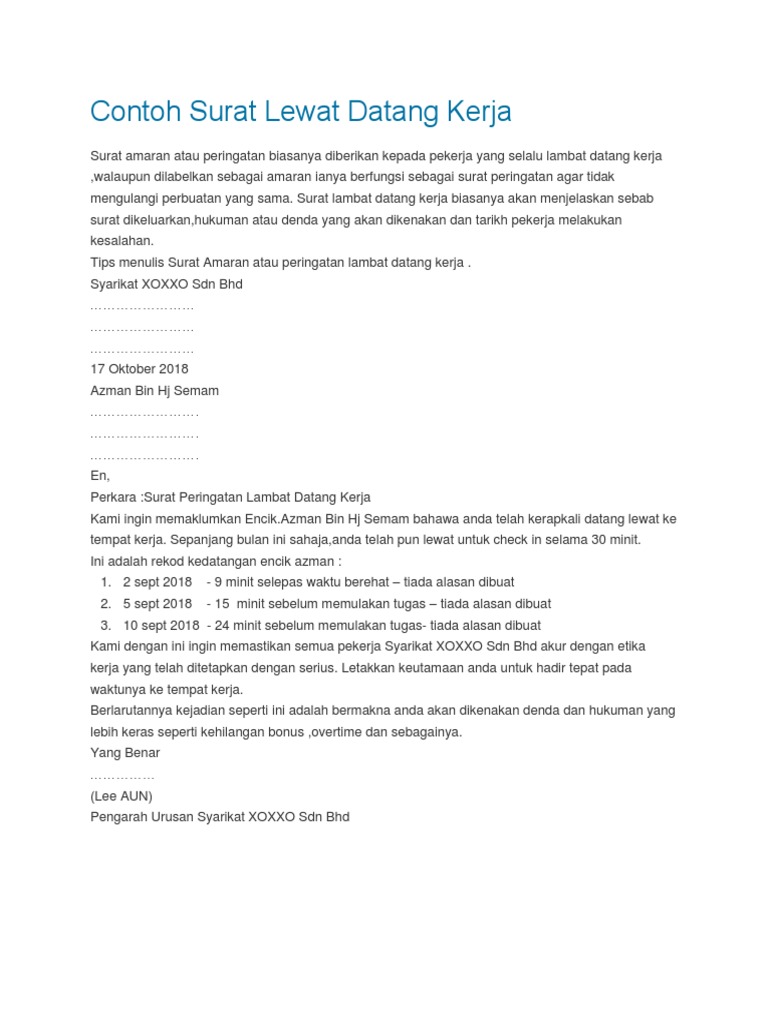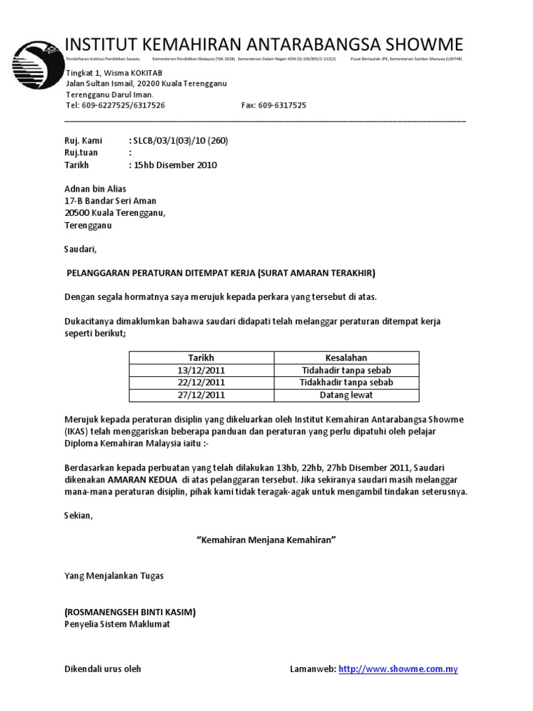 Surat Amaran Untuk Pekerja Tidak Hadir Kerja - Pengertian surat referensi kerja adalah sebuah surat yang dikeluarkan oleh perusahaan untuk menerangkan mengenai perilaku, jabatan, dan kinerja.. Pengertian surat lamaran kerja adalah surat permohonan yang dikirimkan oleh pencari kerja kepada badan usaha atau instansi untuk mendapatkan pekerjaan atau jabatan sesuai dengan posisi yang sedang ditawarkan. Download & view contoh surat amaran untuk pekerja as pdf for free. Isu uum saman raja petra dan suara keadilan rm7 juta via muhtarsuhaili.wordpress.com. Pengetahuan menyangkut format atau bentuk surat lamaran kerja untuk suatu lowongan pekerjaan tertentu seringkali dianggap mudah, namun tidak jarang justru gagal mendapatkan pekerjaan hanya karena kurang paham dan cermat dalam membuat surat lamarannya. Contoh surat amaran dibawah sesuai digunakan bagi menegur pekerja dengan c.