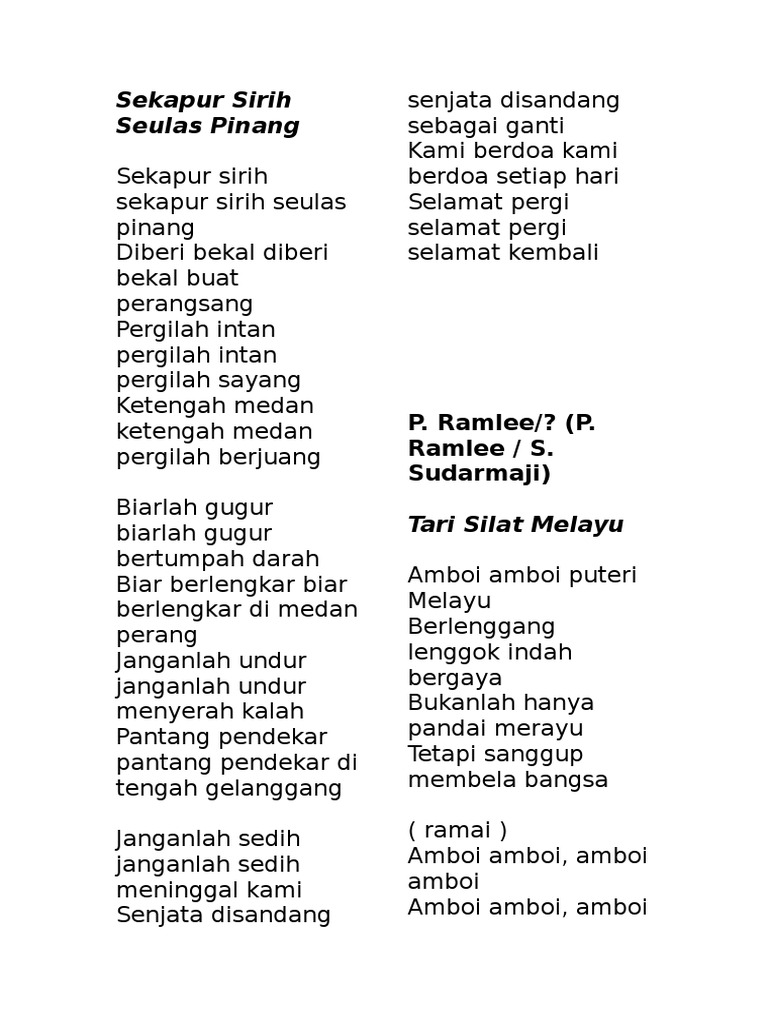 Biarlah gugur biarlah gugur bertumpah darah biar berlengkar biar berlengkar di medan perang janganlah undur. Pergilah intan pergi intan pergilah sayang ke tengah medan ketengah medan, pergilah berjuang. Sekapur sirih sekapur sirih seulas pinang diberi bekal diberi bekal buat perangsang pergilah intan pergilah intan pergilah sayang ketengah medan ketengah medan pergilah berjuang. Saloma sekapur sireh seulas pinang. Sekapur sirih seulas pinang (betel leaf and betel nut) album: